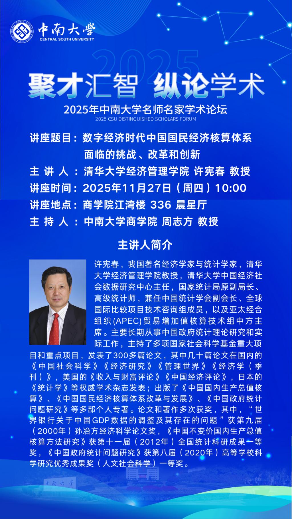 中南大学名师名家学术论坛——数字经济时代中国国民经济核算体系面临的挑战、改革和创新